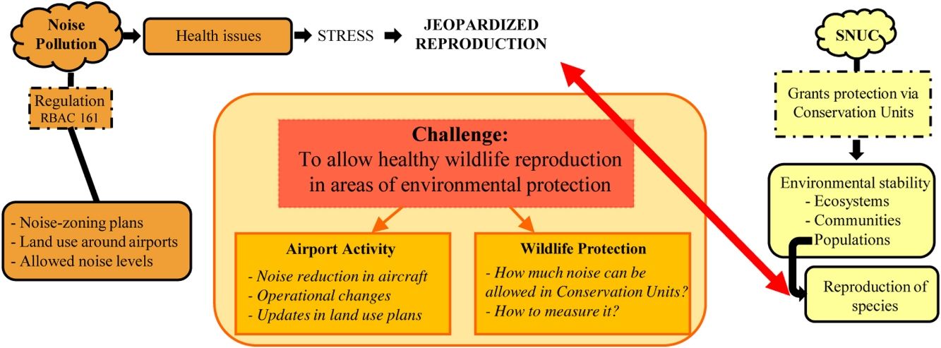 Noise produced by aircraft is a concern for human populations and its production is controlled by specific laws around the world. Here, we address the conflicting existence of Natural Protected Areas (PAs) of high priority conservation located within noise-impacted areas of Brazilian airports and discuss how noise can generate physiological stress and jeopardize wildlife breeding. Further, we review how this subject has been handled around the world, and highlight the need to initiate a discussion focused on Brazilian legislation, setting in motion an evidence-oriented policy that considers the needs of wildlife for an environmental protection area and for the control of human produced-noise pollution.
