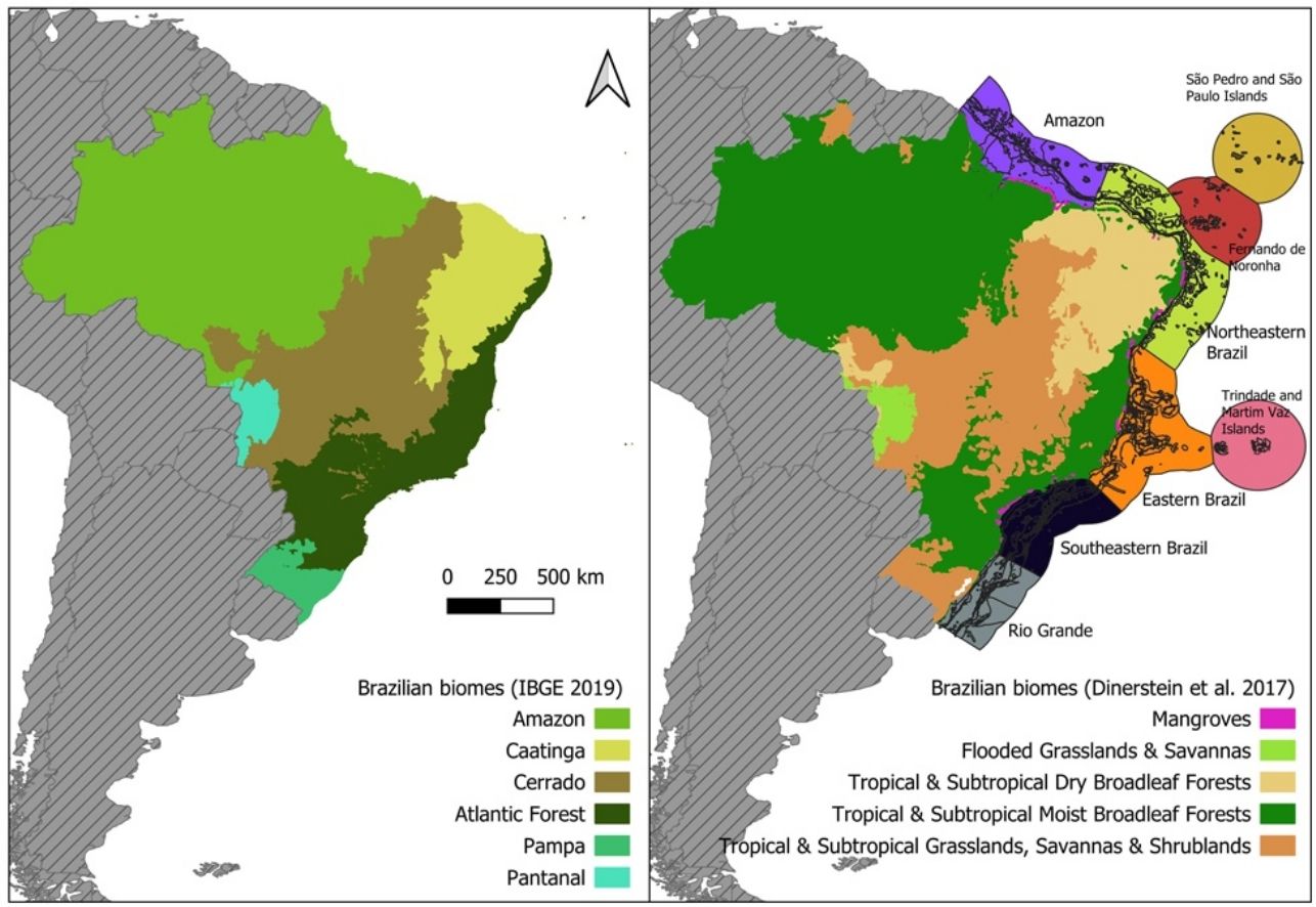 Brazil has six officially recognized biomes (IBGE, 2019): Amazon, Atlantic Forest, Caatinga, Cerrado, Pampa and Pantanal. These biomes (sensu IBGE) also correspond to the major phytogeographic regions of the country. The corresponding biomes in an international biome classification (Dinerstein et al., 2017) are ‘Tropical Moist Broadleaf Forests’ (including IBGE's Amazon, Atlantic Forest), ‘Tropical and subtropical Dry Broadleaf Forests’ (Caatinga), ‘Tropical and Subtropical Grasslands, Savannas and Shrublands’ (Cerrado, Pampa) and ‘Flooded Grasslands and Savannas’ (Pantanal). Note that the two classification systems differ concerning biome boundaries, reinforcing that biome-based conservation strategies can be problematic, as they depend on the details of specific classifications. In addition, the country is slowly moving towards officially recognizing eight distinct coastal-marine ecosystems in its Exclusive Economic Zone (Magris et al., 2021), which is central to advance our understanding on the ecological interconnections between land and sea ecological processes and develop better-informed conservation policies.