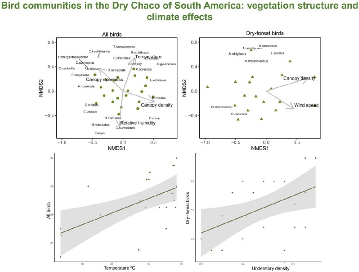 DiscussionLand use change due to agricultural expansion is crucial to biodiversity loss, especially in the forest tropics. However, understanding the environmental consequences of habitat changes, particularly vegetation structure and climate factors and their relation to biodiversity, remains unknown. The tropical dry forest is affected by being understudied yet disappearing faster in South America. To our knowledge, we provide the first assessment of the effects of climate and vegetation structure on avian communities in the Dry Chaco, a global deforestation hotspot. Our study contributes with four main insights. First, forest structural connectors not only connect the landscape but may facilitate the movement of species, having a high potential for management and connectivity planning. Second, our study revealed significant differences in the responses of bird communities to environmental changes when focusing on all birds or when analyzing dry-forest birds only. For all birds, composition revealed preferences of habitat. Birds of open habitats were positively associated with canopy openness, temperature, and relative humidity, while birds that avoid open habitats were positively associated with higher canopy density. This highlights the importance of the forest to maintain a microhabitat for birds that avoid open habitats, being more sensitive to changes in vegetation and climate effects. Third, the most important variable explaining dry-forest bird variations was understory density. This emphasized different responses when focusing on all birds to more specialist birds and the importance of vegetation structure in the dry forest, even lower strata, especially for the dry season. Fourth, richness increases with temperature for all birds. Even higher temperatures may contribute to richness, but higher temperatures during the day decrease bird activity. This is especially important considering the dry forest, where temperature rises during the day, affecting bird activities, and there are many conservation concerns to maintain an adequate microclimate.