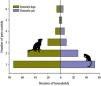 Direct predationOf the participants who indicated having at least one pet (n = 243), 110 (45.3%) reported that they had observed at least one DP of a bird by their pets (Fig. 2). Cats were responsible for 72 (65.5%) of these predation events, while 49 (44.5%) were carried out by dogs (Fig. 2); 11 participants indicated that their cats and dogs were both bird predators. Considering only participants who owned both pet species (67), 32 (47.8%) had observed DP involving only their cats and 8 (11.9%) had observed DP only by their dogs, while 9 participants mentioned that both pets had preyed on a bird at least once (13.4%).