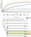 Sampling representativeness and species diversity across vegetation cover units. The curves depicted above approach the asymptote, indicating that the sampling is representative of the studied area. Representativeness percentage ranges from 77 to 100% (Villarreal et al., 2006). The Jaccard similarity index is presented for each vegetation cover unit to illustrate species diversity. The colored lines correspond to each unit's absolute abundance (orange) and species richness (purple). The shaded area in the figure represents the clade with the highest Jaccard similarity value, which is approximately 24%. The dotted line indicates the cut-off point for the similarity of the most similar group.