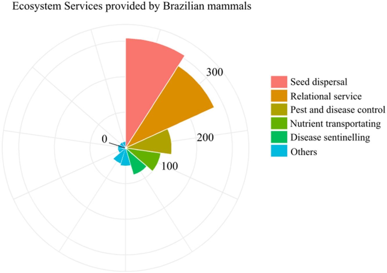 Here, we carried out this exercise for around 700 mammal species native to Brazil, a megadiverse country that is quickly building knowledge on the ESs delivered and supported by its biodiversity (BPBES, 2018; Pires et al., 2018). This study has three objectives: (i) creating a comprehensive database on the ESs delivered directly and indirectly by Brazilian mammals, (ii) describing mammal diversity patterns associated with each ES, and (iii) mapping the distribution of ES associated with mammals across Brazil.