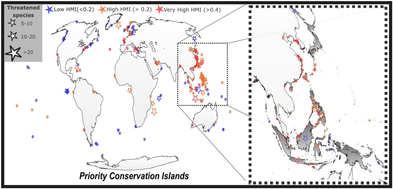 The dark side of this is given by the fact that only four of them (see Fig. 2) are located in the most threatened region for island conservation, east and southeast of Asia, and so improving the conservation picture in this region should primarily focus on the identified priority islands of high (or extreme) human modification. The panorama for priority islands of high and extreme human modification is a bit different. The most important point is perhaps that the confirmed presence of a given threatened vertebrate species does not ensure that the species is still present or that its populations are still viable under such high and extreme human modification already present. In this regard, while these islands represent potentially important conservation opportunities given their potentially high richness of threatened vertebrate species, they should be strongly monitored before taking any conservation decision. Accordingly, we propose that these islands would represent priority research areas (see Refs. Nori et al., 2018, 2020), where actions aimed to improve the knowledge regarding threatened vertebrate species are imperative (e.g. confirm the presence of such species and gather knowledge on their current conservation status). Considering that major conservation efforts in the most threatened island region of the world (east and Southeast Asia) could be conducted in such highly modified islands, policy-making is urgently needed in this region.