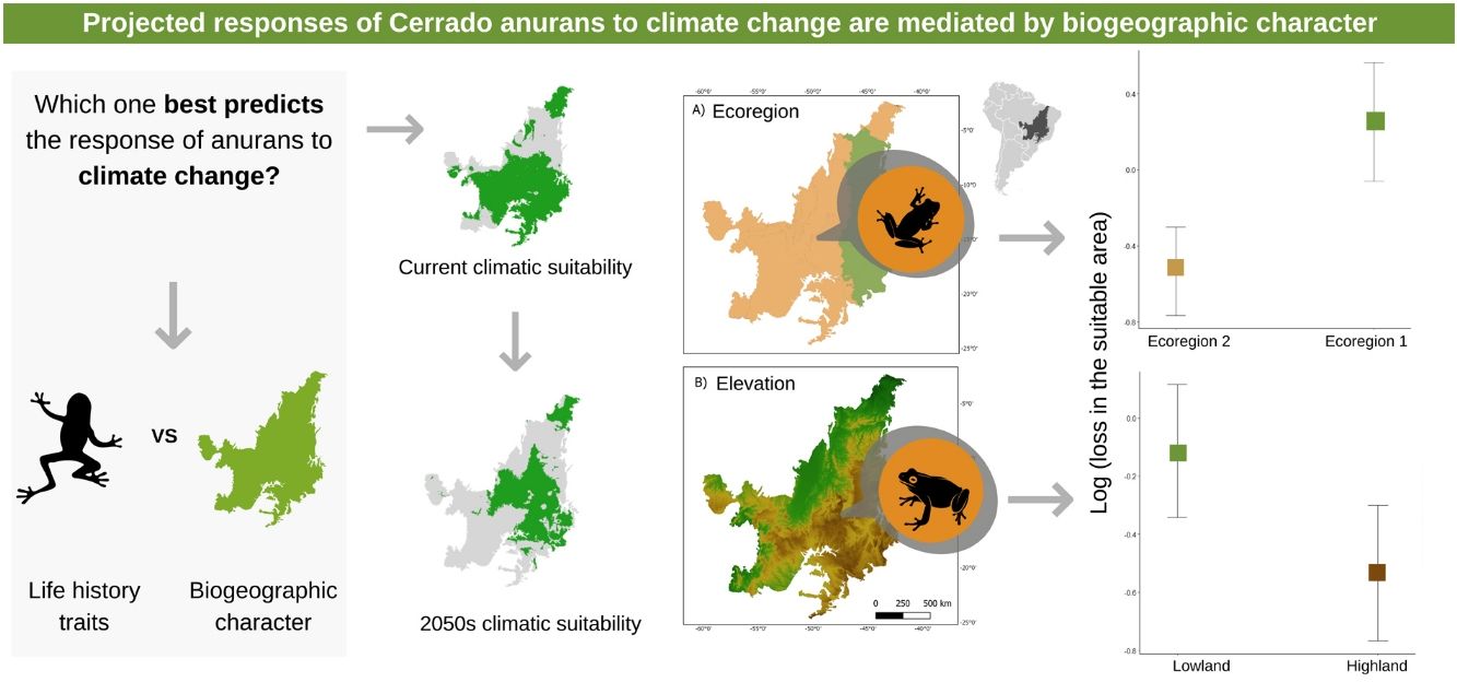 Climate change has affected the distribution and phenology of several species. However, due to narrow ecological and physiological tolerances, not all species are affected in the same way. Here, we test whether life history characteristics and biogeographic character influence the response of Cerrado anurans to climate change using ecological niche models. Our results demonstrate that a reduction in the potential distribution area is expected for most species in both optimistic (∼ 70%) and pessimistic (∼ 65%) emission scenarios. At first glance, this result might seem illogical, but when we assessed the magnitude of the losses, we found that even though more species lost area in the optimistic scenario, the amount of area lost was less than in the pessimistic scenario. Our findings also show that species that inhabit higher-altitude areas and the Western Cerrado will be more vulnerable to climate change. This shared “destination” in the face of climate change is associated with the sharing of some climate niche attributes among species in the same region, leading to similar responses. This data can be used to support biodiversity protection measures, such as the creation of a system of ecological corridors that allows the species tracking optimal climatic requirements in space.