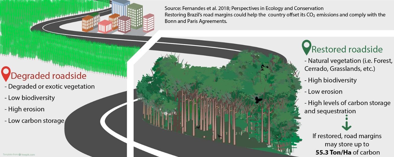 In this paper, we advocate for a well conducted and scientifically oriented restoration of roadsides. We define roadsides as the environment alongside paved roads, which in Brazil generally comprises 15m on each side. These areas have been completely neglected as a target for restoration, despite their high potential. Roadsides occupy a considerable area but are often degraded, suffering from erosion, covered by invasive species, or even left in bare soil. In some cases, roadsides are illegally used for parking, house construction, and increasingly for food production. The latter can have different forms, depending on the socio-economic context of the region: they may be used for small-scale farming, often using slash and burn as the management strategy, or simply be incorporated into adjacent agricultural areas. The construction of paved roads and their management has many impacts on biodiversity and ecosystem services around the world, including wildlife kills, the spread of wildfires and invasive species, chemical and noise pollution, erosion, and watercourses siltation (see Ibisch et al., 2016 for a recent review). Even more importantly, roads are a major facilitator of (often uncontrolled) deforestation, especially in tropical countries (Laurance et al., 2009). In the Brazilian Amazon, for example, 94% of deforestation has occurred within 5.5km of a road (Berber et al., 2014) and represents a great threat to biodiversity (Vale et al., 2008).