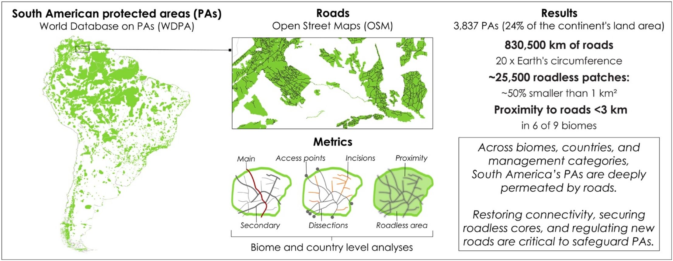 No biome is immune to these pressures. For instance, in tropical forests, more than 95% of land-use change, fires, and carbon emissions occur within 50 km of a road (Barber et al., 2014). In arid and semi-arid regions, roads can lead to soil erosion, hinder species movement and communication, and facilitate the introduction of invasive species (Cappa et al., 2019; Dean et al., 2019). Additionally, genetic studies have documented reduced genetic diversity in populations isolated by road infrastructure in dryland environments (Ascensão et al., 2016; Holderegger and Di Giulio, 2010; Sunnucks and Balkenhol, 2015). Thus, pervasive road infrastructure within South America’s PAs presents an overlooked threat to the continent’s primary conservation strategy, which aims to “enhance the state of biodiversity by safeguarding ecosystems, species, and genetic diversity”.