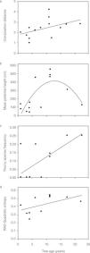 Shrub and tree growth forms, pubescence, potential height, leaf form, and presence of thorns jointly expressed significant trait-divergence patterns related to tree age. Functional diversity was positively related to tree age, as indicated by the regression of Rao quadratic entropy (calculated only for these traits) on tree age (Fig. 2d).