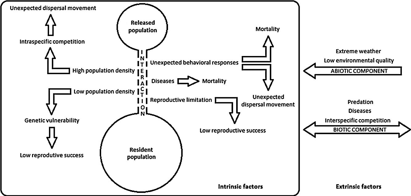 Unexpected dispersal movement of released individuals was another important failure driver highlighted herein. This driver decreases the possibility of the population establishment post-release (Dickens et al., 2009), mainly owing to either chance fates of those individuals (demographic stochasticity) and to low reproduction or survival rates of the remaining population, due to low densities – Allee effects (Caughley, 1994; Armstrong and Wittmer, 2011). In our study, we observed one critical reintroduction attempt involving Tuamotu kingfishers (Todiramphus gambieri gertrudae), where all animals returned to the donor area (Kesler et al., 2012). However, in contrast, another study with Mauritius kestrel (Falco punctatus) revealed that restricted dispersal affected territory occupancy patterns (Burgess et al., 2008). For Armstrong et al. (2013), post-release dispersal is a key factor affecting the success of ecological restoration projects, and therefore, the failure risk should be potentially reduced by managing dispersal, by translocating more animals to compensate for dispersal, or by avoiding release in areas prone to dispersal.