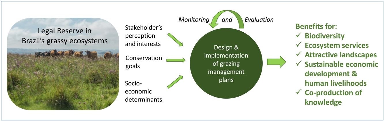 We argue that grazing can be an important conservation tool when properly applied in terms of grazing strategy (stocking rate, grazing periods). As grazing can ally conservation with economically interesting activity, its use appears to be of special relevance in Legal Reserves in Brazil. A research agenda, developed in partnership with land users so that both conservation and economic feasible use can be evaluated, is necessary. This research agenda should include, across distinct grassy ecosystems, the study of the interaction between grazing and biodiversity and natural resources, as well as socioeconomic feasibility and determinants of grazing. In Brazil’s grassy ecosystems, grazing in the Legal Reserve can represent the rescue of a socio-cultural tradition which, if supported by science, will enlarge and strengthen the knowledge of the system’s dynamics by and for its users, researchers and policy makers, generating additional income and at the same time, expanding the conservation of grassy ecosystems.