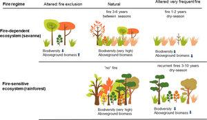 The relationship of fire with the evolutionary history of vegetation in BrazilBrazil's biomes and ecosystems differ in their response and vulnerability to fire. Ecosystems characterized by the dominance of grasses - grasslands and savannas - coevolved with fire, and their plants and animals show several adaptations and synergies with fire; therefore, they are considered as fire-dependent from an ecological perspective. The opposite is true for the country's tropical forests that are not fire-adapted and do not easily burn, unless when suffering extreme drought or degradation that can make them more vulnerable to fire. When these forests do burn, fire can cause severe negative effects on their biodiversity, and thus they are considered as fire-sensitive. Overall, fire-dependent ecosystems benefit from fires for maintenance of their biodiversity and ecological processes, while the opposite occurs in the case of fire-sensitive ecosystems. Fire impacts in a given ecosystem - whether it is fire-dependent or fire-sensitive - is determined by the fire regime, i.e. the pattern of fire type, frequency, seasonality, intensity and extent. Natural fire regimes have been modified by human activities – usually related to land use practices or due to climate extremes linked to global warming and to climate change – and often towards higher frequency and extent, as well as altered seasons. Such altered fire regimes usually bring negative effects, not only on biodiversity but also on ecosystem processes and services for human populations. However, in the case of most protected areas, fire has been banished even though the ecosystem is fire-dependent, what will also lead to important ecological changes and often to a rather rapid loss of their natural characteristics. The trade-offs among the distinct effects of fire on the environment, from biodiversity to ecosystem services, must be considered in all discussions about the fire issue.