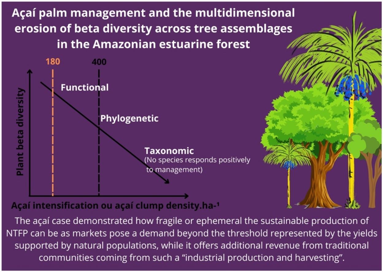 Here, we test the hypothesis that açaí intensification reduces tree-assemblage beta diversity considering the taxonomic, phylogenetic and functional dimensions in the Amazon estuarine forest, the current core area of açaí fruit production. Although previous findings have already documented significant drops in taxonomic alpha diversity at particular sites (Freitas et al., 2021; Barros et al., 2023), beta diversity at regional spatial scale and potential processes such as biotic homogenization and community nestedness have never been examined considering taxonomic, phylogenetic and the functional dimension of the native assemblages. We refer to a potential regional-wide forest degradation in addition to other current drivers such as logging, edge effects, intense droughts and wildfires (Lapola et al., 2023). Diversity scores from 47 tree assemblages spread across the region were contrasted to clump.ha−1. Moreover, clump density thresholds are associated with expressive decline on tree species richness, but also with the taxonomic and ecological groups which decline as açaí clump density increases. Our uncovered patterns are discussed in the light of underlying mechanisms leading to forest impoverishment, their consequences, lessons and potential mitigation guidelines.