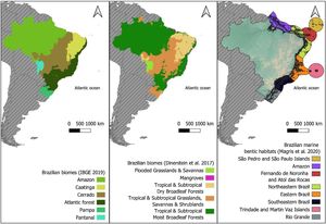 Brazil has six officially recognized biomes (IBGE, 2019): Amazon, Atlantic Forest, Caatinga, Cerrado, Pampa and Pantanal. These biomes (sensu IBGE) also correspond to the major phytogeographic regions of the country. The corresponding biomes in an international biome classification (Dinerstein et al., 2017) are ‘Tropical Moist Broadleaf Forests’ (including IBGE's Amazon, Atlantic Forest), ‘Tropical and subtropical Dry Broadleaf Forests’ (Caatinga), ‘Tropical and Subtropical Grasslands, Savannas and Shrublands’ (Cerrado, Pampa) and ‘Flooded Grasslands and Savannas’ (Pantanal). Note that the two classification systems differ concerning biome boundaries, reinforcing that biome-based conservation strategies can be problematic, as they depend on the details of specific classifications. In addition, the country is slowly moving towards officially recognizing eight distinct coastal-marine ecosystems in its Exclusive Economic Zone (Magris et al., 2021), which is central to advance our understanding on the ecological interconnections between land and sea ecological processes and develop better-informed conservation policies.