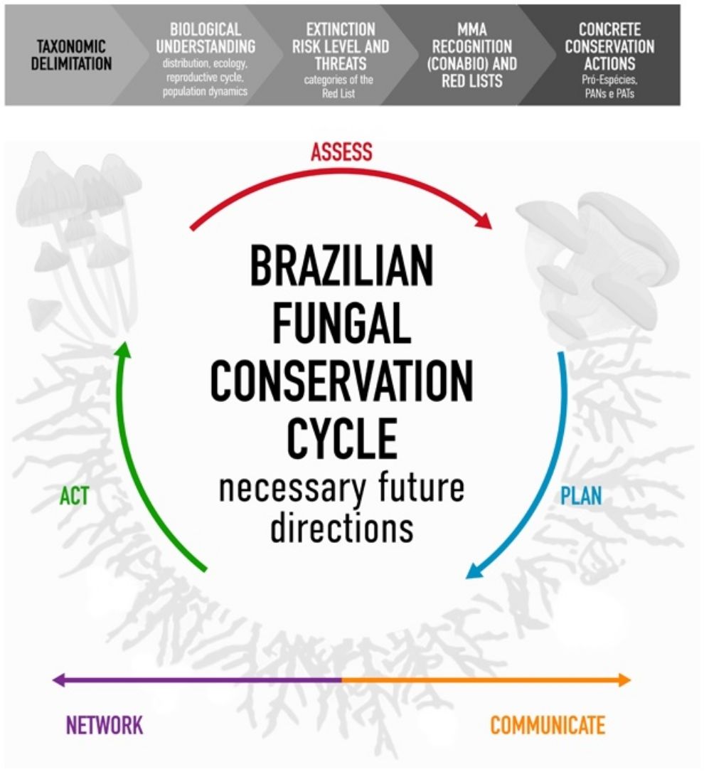 Despite the historical neglect of fungi in national conservation programs, the published Decree No. 12.137/2024 opens new horizons for the directives governing the effective fungal conservation in Brazil. Involvement from society and government is crucial to completing the Species Conservation Cycle—Assess, Plan, Act, Network, and Communicate (Rodríguez et al., 2022). Therefore, the formal recognition of funga in Brazilian legislation, including the establishment of an official national Red List, represents an essential step in advancing government policies and fungal conservation.