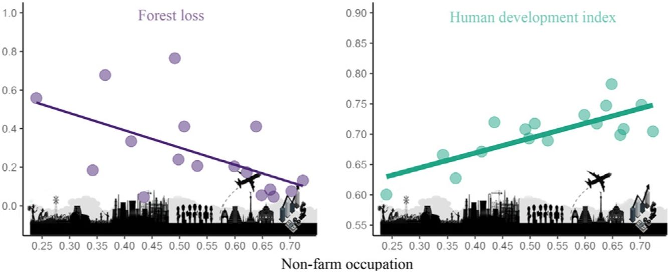 Underlying drivers of forest cover changesOur findings indicate that the forest loss rate inside the reserves is mainly related to two main underlying drivers, positively to the density of rural settlements and negatively non-farm occupation. These results suggest that the lack of job opportunities in rural areas, beyond those offered by the agricultural sector, accentuates deforestation as the demand for agricultural land increases in the absence of other livelihood options. As reported by previous studies, reduction of forest loss rates is associated with the increase of non-farm labor activities (Hoang et al., 2014; Wunder, 2003), since these allow local people to obtain revenues without the need of causing more deforestation for arable land (Curtis et al., 2018; Kovacic and Viteri Salazar, 2017; Vedeld et al., 2007). In parallel with these studies, we found that reserves embedded in municipalities with greater labor opportunities in non-farm sectors, especially in the industrial activities (e.g., manufactures, electricity, or construction, see Table S4, Appendix 1), endure lower forest loss rates (Goers and Lawson, 2009). Also, a higher human development index was associated with a greater non-farm occupation (Fig. 4). This finding concurs with studies pointing out that non-farm activities allow local people to obtain higher profits and deal with poverty (Haggblade et al., 2007). According to our study, the emerging non-farm occupation may promote a “win-win” scenario with a positive balance between conservation and development, especially considering that an incipient forest transition process in southern Mexico has been identified (Vaca et al., 2012). However, it is important to note that this “win-win” scenario is likely limited to regions dominated by subsistence agriculture, such as the study reserves in Mexico (Bonilla-Moheno and Aide, 2020; Curtis et al., 2018). Additional studies are required in places where large-scale agriculture oriented to the production of commodities occurs, as the diversification of labor activities could have a relatively weak effect on deforestation rates in contexts where agriculture is typically supported by large capitals.