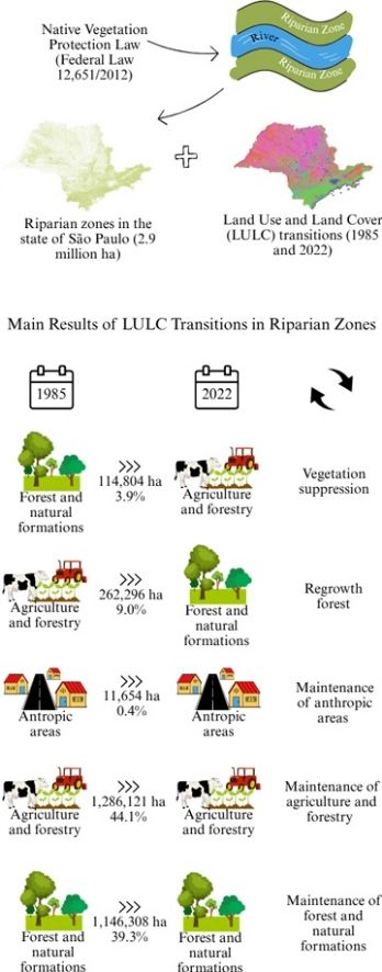 In this scenario, estimates of degraded riparian PPAs may be influenced by the application of the principle of temporality, particularly in highly urbanized regions such as São Paulo State, where most of its 645 municipalities have outstanding debts in preserving riparian vegetation (Murakami et al., 2023). We hypothesize that changes in environmental legislation can promote an increase in forest cover within protected areas. Additionally, we hypothesize that anthropogenic areas eligible for regularization under the principle of temporality are spatially isolated and do not extend continuously along PPAs, representing a minor proportion of the total PPAs area. This study aimed to analyze the panorama of riparian PPAs in São Paulo in 1985 and 2022, characterizing the predominant land use and occupation within these protected areas, as well as the processes of ecological restoration and suppression of native vegetation that occurred over this period, based on the PPA delimitation criteria established by the NVPL. Since the time series begins in 1985, the study also provided, for the first time, an estimate of the extent of PPAs occupied by anthropogenic uses under the framework of Law 4,771/1965, prior to the 1986 amendments, that remain in this condition until 2022, and which could therefore be subject to regularization under the principle of temporality adopted by CETESB.