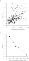 ResultsThe overall FST when comparing all populations was equal to 0.267, but values ranged from 0.050 to 0.565 when comparing distinct pairs of populations. The pairwise genetic divergence based on linearized FST values was positively correlated with geographical distances (r=0.487; P<0.01; Fig 2a), with the correlogram revealing a more clinal pattern of genetic variation in which close populations are similar up to 1,000km, and stabilize after this class (Fig. 2b). The metrics of landscape characteristics, on the other hand, were poorly geographically structured (Table 1), indicating that patterns of habitat fragmentation were not evenly distributed in the biome.