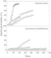 Seeds of E. edulis reached the GT50% most rapidly at Ψ=0MPa under light and dark and in the flood treatment (Fig. 1; Table 1). However, seeds of E. edulis subjected to Ψ=−0.4 and Ψ=−0.8MPa showed an increase of 2.5- and threefold in the GT50%, respectively (ANOVA, F=21.79, p<0.05, n=10; Table 1). The GT50% of L. weddellianum was ca. fivefold higher than that of E. edulis at Ψ=0MPa under light (Fig. 1). There was no significant difference in the GT50% of seeds of L. weddellianum between light and dark treatments (t-value=0.92, p>0.05, n=10; Table 1). The GT50% of the seeds of L. weddellianum subjected to the Ψ=−0.4MPa and flood treatments, increased ca. two- and 1.5-fold, respectively. In contrast to L. weddellianum, 23% and 68% of the seeds of E. edulis subjected to 90 days of low water potential and 45 days of flooded conditions remained viable, respectively (Fig. 2).