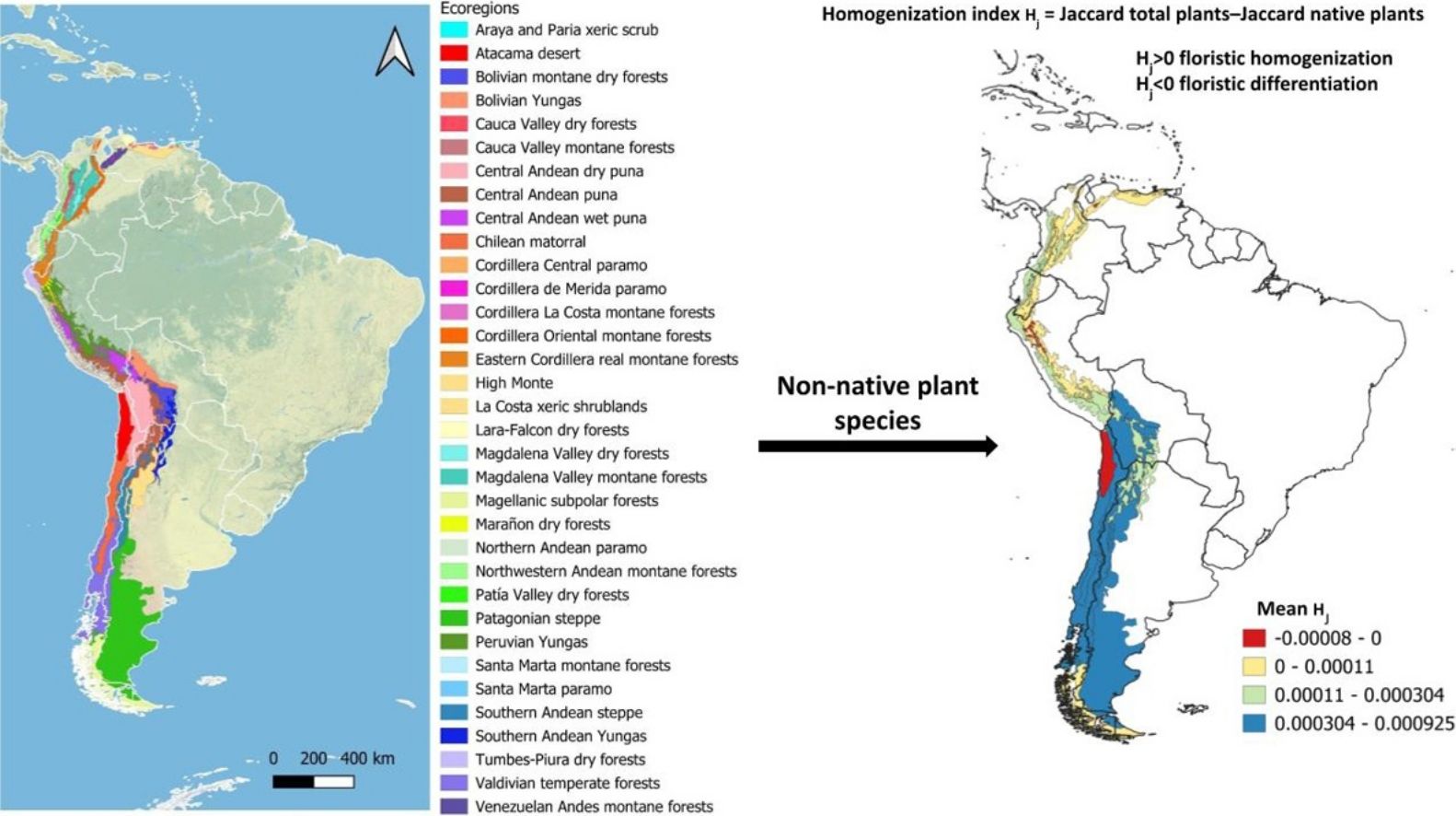 Numerous studies have analyzed the ecology and biogeography of Andean non-native plants (e.g., Pauchard and Alaback, 2004; Fuentes-Lillo and Pauchard, 2019; Fuentes-Lillo et al., 2023; Fernandez et al., 2025) but few of them have focused on their local effects on biotic homogenization or differentiation (e.g., Castro and Jaksic, 2008; Hurtado-M et al., 2021). A regional-scale evaluation of homogenization or differentiation encompassing the full Andean range is lacking. Thus, our study aims to provide the first regional assessment of whether non-native plant introductions are associated with floristic homogenization or differentiation among Andean ecoregions.