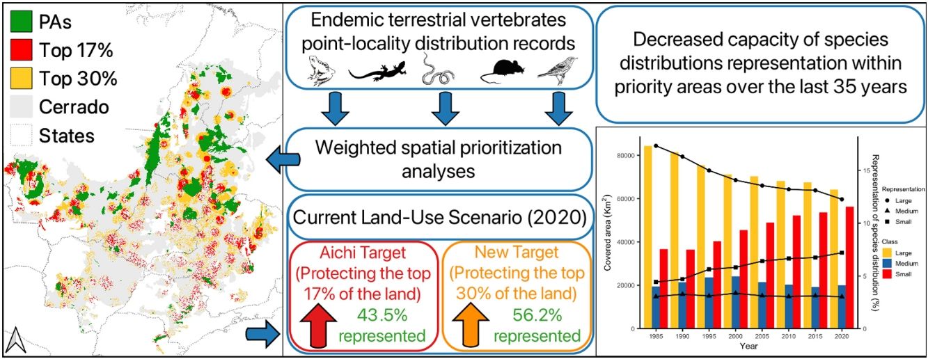Creating and managing strategic protected areas (PAs) is fundamental for biodiversity conservation. They are essential to reaching nature-based solutions for adaptation to global changes (Maxwell et al., 2020), maintaining wildlife populations (Geldmann et al., 2013), and ensuring long-term maintenance of nature’s contributions to people (Díaz et al., 2018). Worryingly, despite the sustained increase in numbers of PAs globally (Maxwell et al., 2020), historically PA allocation has not met scientific criteria, being influenced by economic activities and opportunism (Margules and Pressey, 2000). This is particularly true in economically productive ecoregions (Prieto-Torres et al., 2022) such as the Cerrado hotspot (Strassburg et al., 2017; Vieira et al., 2019). In this context, science has developed systematic conservation planning protocols to achieve resilient and effective PAs, based on objective criteria and relevant information (Margules and Pressey, 2000; Di Minin et al., 2014).