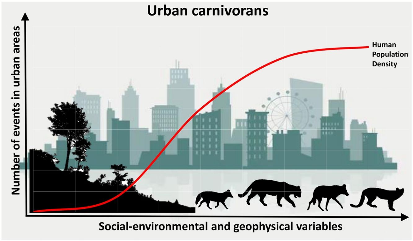 Terrestrial carnivore mammals (Order Carnivora) are particularly vulnerable to urbanization due to their high spatial and energetic requirements (i.e., home ranges and trophic level), low reproductive rates, and human-wildlife conflicts, for example, persecutions or retaliatory hunting (Barker et al., 2023). However, despite the numerous barriers imposed by the urban environment across its highly modified landscapes, such as decreases in vegetation cover and natural resources, habitat fragmentation and degradation, extensive road networks, and unsuitable climate conditions (Barker et al., 2023), it is intriguing to observe the establishment of several carnivorans in cities worldwide. For example, we highlight the Red foxes (Vulpes vulpes) in Great Britain (Scott et al., 2014), Raccoons (Procyon lotor) — arguably one of the most common carnivores in North American cities (Hadidian et al., 2010), Japan and Germany where it was introduced (see Bateman and Fleming, 2012) —, and Coyotes (Canis latrans) across cities Southwestern North America (Gehrt et al., 2010).