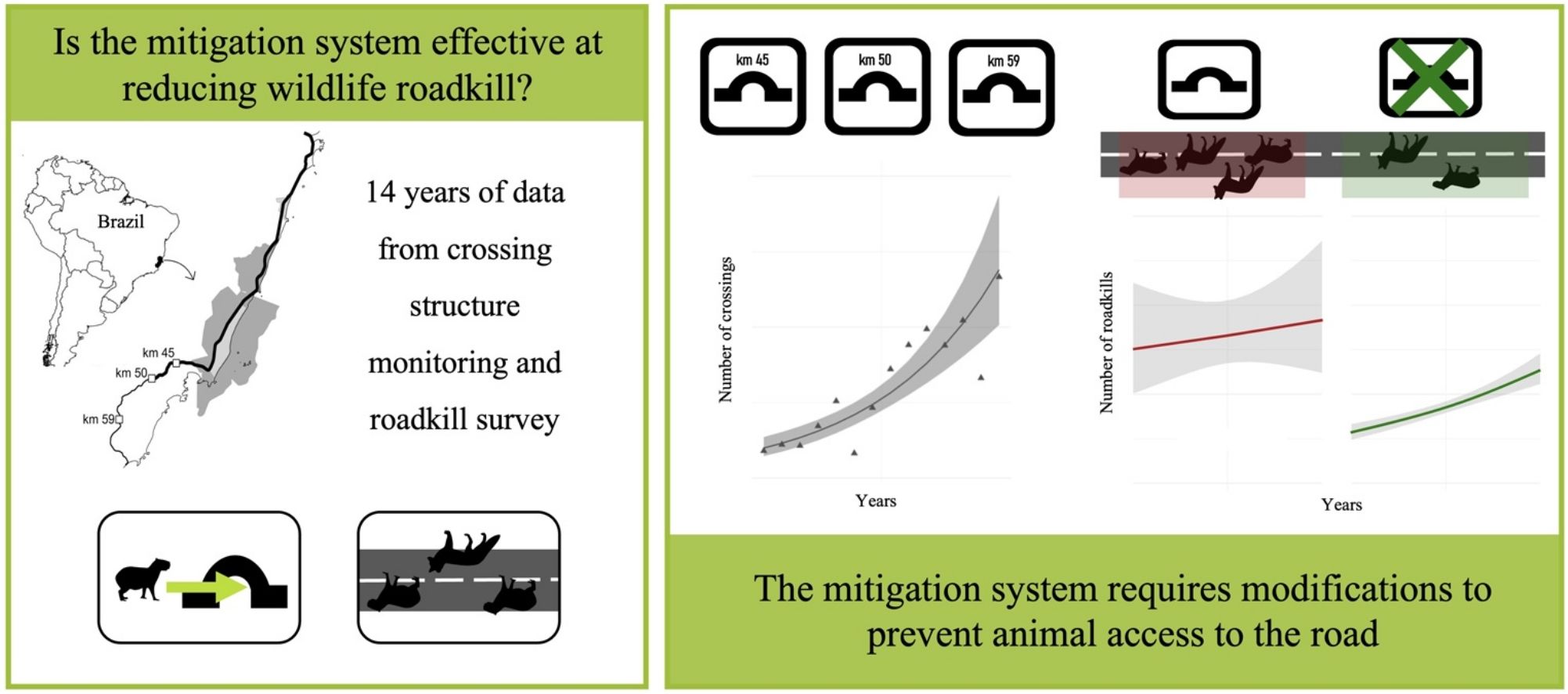 We evaluate a mitigation system composed of three clusters of multiple wildlife crossing structures and fences installed during improvements to a coastal toll highway in southeastern Brazil to reduce wildlife road mortality. We analyze the use of wildlife crossing structures and roadkill data of ground-dwelling species weighing more than 1 kg, including medium-to-large mammals, reptiles (boid snakes, tegu lizard and broad-snouted caiman), and red-legged seriemas, collected daily over 14 years. Our aim was to assess whether the crossing and roadkill records (number and hotspot locations) changed over the years. We expected a gradual increase in the number of crossings, given the known time lag in habituation behavior for newly mitigation measures (Bond and Jones, 2008; Clevenger and Waltho, 2003; van der Grift et al., 2013). Furthermore, if fences were effective in blocking animal access to the road, we should expect a significantly lower number of roadkill records on mitigated road segments compared to those on non-mitigated road segments and the disappearance of roadkill hotspots on mitigated segments (Rytwinski et al., 2016).