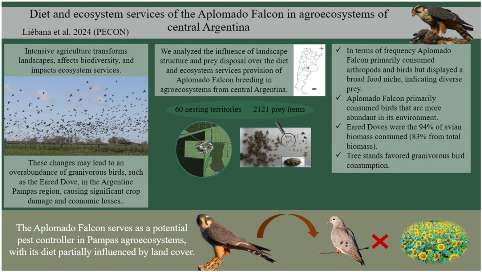 Agricultural expansion and land-use intensification have transformed Argentina’s Pampas region, leading to biodiversity declines and ecosystem imbalance. This study examines the Aplomado Falcon (Falco femoralis) as a potential biological pest controller in agroecosystems of central Argentina. We evaluated how landscape structure and prey availability influenced its diet, focusing on the consumption of granivorous birds like the Eared Dove (Zenaida auriculata), a significant agricultural pest. Using regurgitated pellets and prey remains from 60 nesting territories, we identified 83 prey species and assessed prey abundance in the field. Results show the falcon’s diet is dominated by birds, particularly Eared Doves, which constituted 94% of avian biomass consumed. Tree stands positively influenced the consumption of granivorous birds, while arthropod consumption declined in these areas. The study highlights the Aplomado Falcon’s role in pest control, demonstrating its adaptability to agroecosystem modifications. These findings emphasize the ecological and economic importance of raptors in supporting sustainable agriculture.