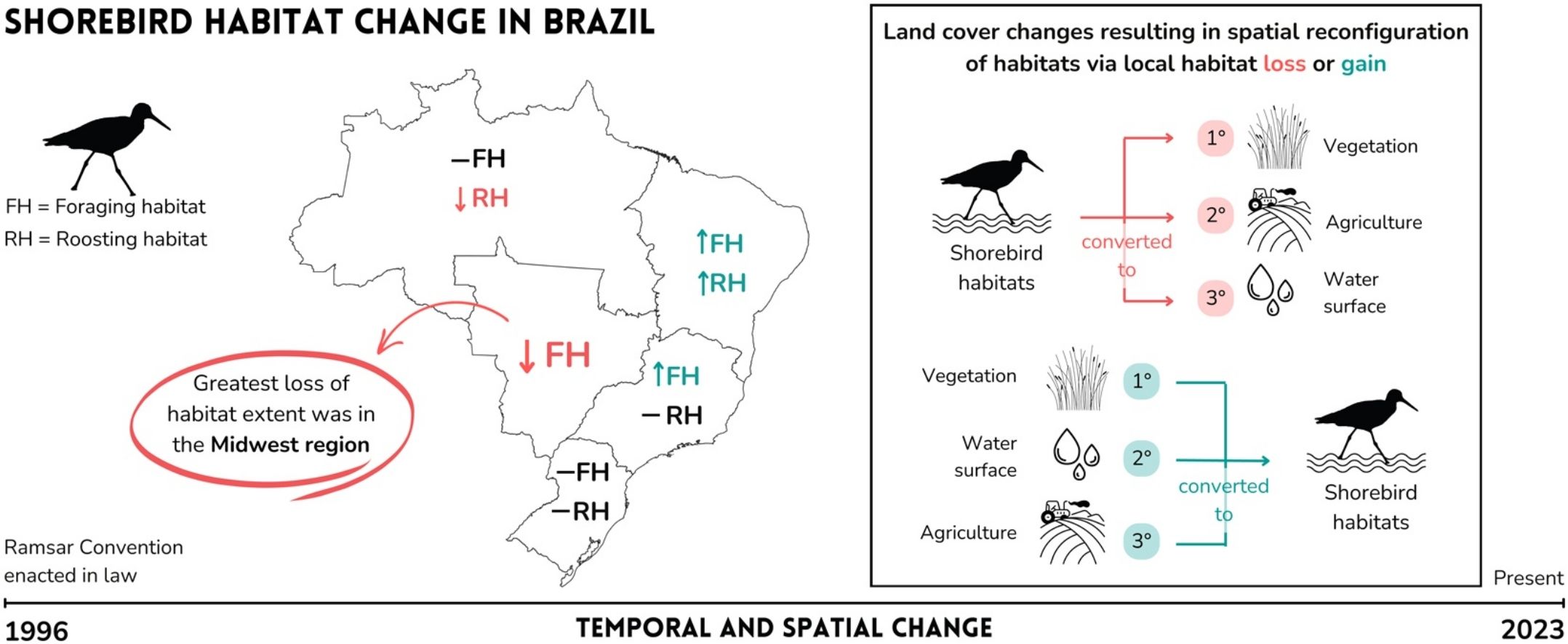 Conservation implicationsThis study is the first temporal and spatial assessment of both shorebird foraging and roosting habitats in Brazil. Our results indicated that although the total amount of habitat may not have changed drastically in most geographic regions since the implementation of Ramsar Convention in the country, there have been consistent spatial changes that could have severe implications for the conservation planning of already threatened site-faithful shorebird species (Handmaker et al., 2024; Musmeci et al., 2022). These species depend on specific sites where they return to every year, and failure to find high-quality habitat to rest and refuel within these sites can compromise the success of their migrations. As an important future step to guide shorebird conservation in Brazil, we recommend combining information on shorebird habitat changes with tracking data to assess whether the birds are actually able to keep up with these alterations. We also recommend that ongoing shorebird conservation initiatives in the country, such as the National Action Plan (NAP) for the Conservation of Migratory Shorebirds (ICMBio, 2023), focus more on the Midcontinent Flyway, given that our observations indicated the Midwest region experienced the strongest decline in shorebird habitats. Although the NAP aims to expand and ensure the conservation of shorebirds and their habitats in Brazil, it does not enlist any specific strategy for the Midcontinent. Finally, we suggest that future studies specifically investigate the effects of climate change on shorebird habitats, as we identified the conversion from wet to dry ecosystems as the primary cause of habitat loss. This indicates that climate change could pose a significant threat to shorebird habitat stability in Brazil.