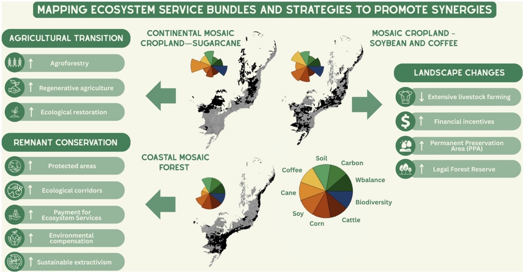 Contributions of ES bundles to policy decisions and environmental managementThe Atlantic Forest, home to over half of Brazil’s population and its main economic centers (IBGE, 2023), faces intensifying trade-offs between provisioning and regulating services due to agricultural and urban expansion. In 2023 alone, 12,094 ha of native vegetation were lost (Mapbiomas, 2024). Our findings provide actionable insights for designing differentiated management strategies that secure multiple ES.