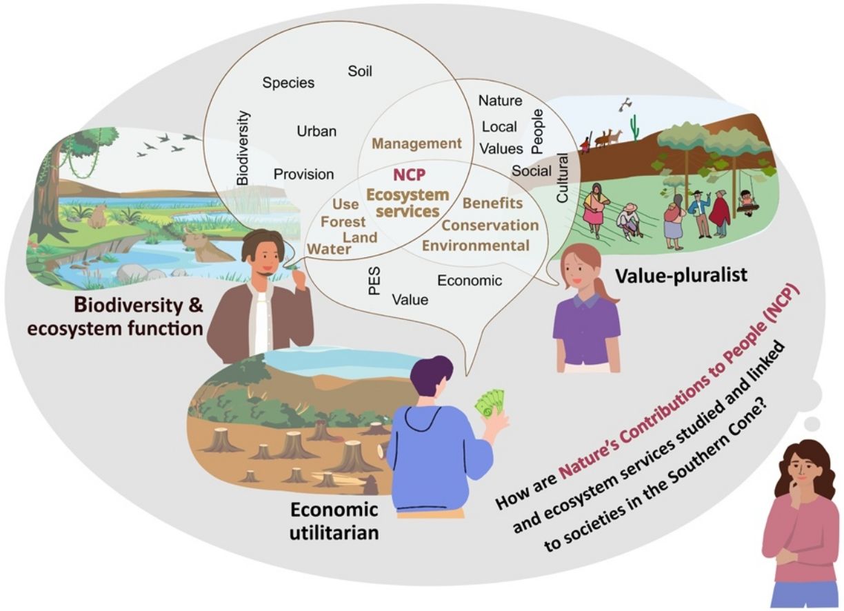 Closing remarksES and NCP are concepts intended to help link nature and society (Raymond et al., 2023). Their current usage in the Southern Cone does not seamlessly track global trends. While there is a continued predominance of ecological perspectives, we found a coexistence of BEF, economic utilitarian, and value-pluralist approaches. The emergence of NCP in recent years is part of efforts to navigate the multiple values of nature (e.g., of the 16 NCP-focused papers identified, 13 were value-pluralist), which requires not just filling geographic, methodological, or knowledge gaps, but also strengthening inter- and transdisciplinary research (Metzger et al., 2024). It implies enhancing broader capacities to link science-society in meaningful engagement platforms that produce salient and legitimate information that can be taken up into decisions from individual to collective levels (Pascual et al., 2023). Latin America offers much to the world in this ‘relational turn’ to sustainability and inclusive conservation (e.g., Escobar, 2018; Gallegos-Riofrio et al., 2022). By being reflexive about our research and training programs, we can strengthen a knowledge dialogue from our own territories that benefits biodiversity conservation and just and sustainable development for Latin America and the world (Anderson et al., 2015).