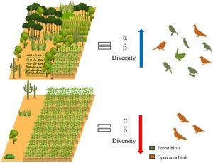 • α and β-diversity of birds is mainly influenced by forest cover.