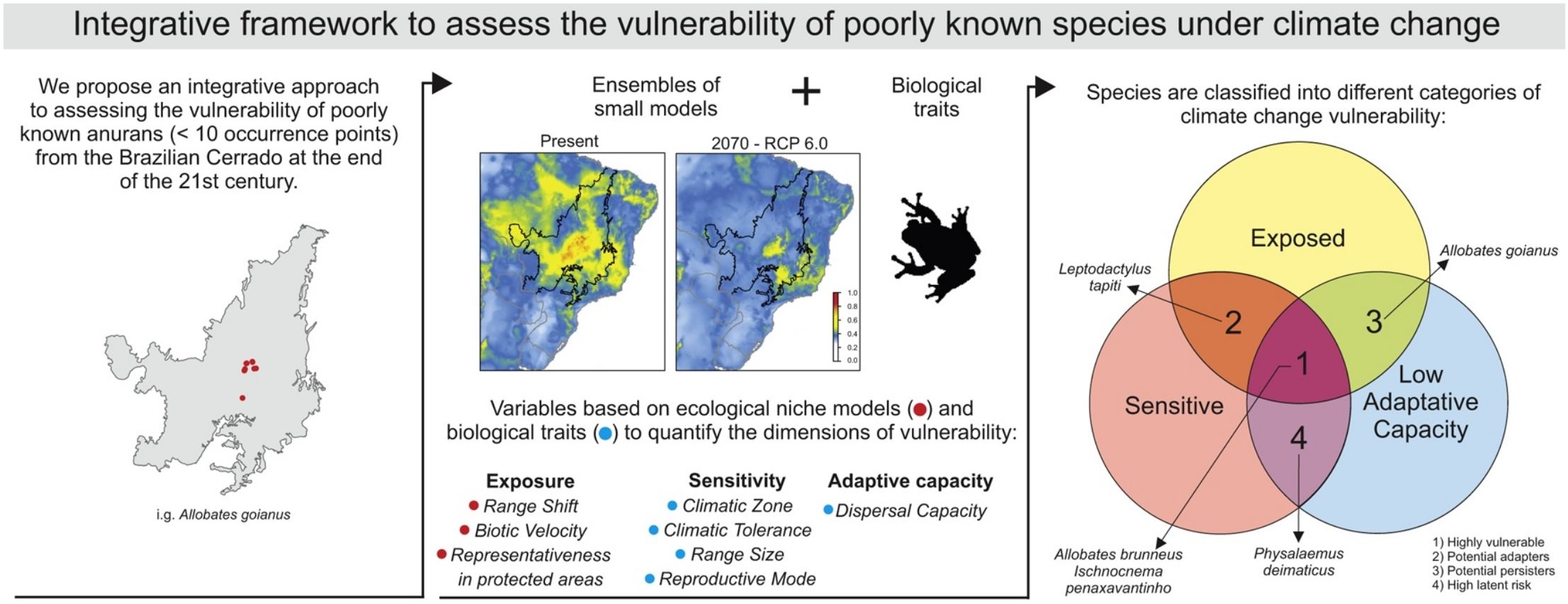 Here, we proposed an integrative approach based on low-cost and rapid-response techniques to assess the vulnerability of poorly known species in the context of climate change scenarios. Specifically, we integrated common biological traits with niche-modeling predictions (Table 1) to independently quantify the exposure, sensitivity, and adaptive capacity of poorly known anurans from the Brazilian Cerrado by the end of 2070. Together, these dimensions capture a broad range of climate-change-related stresses affecting neglected biological groups facing imminent extinction in a critical biodiversity hotspot, thereby presenting a pressing challenge for conservation biogeography at present.